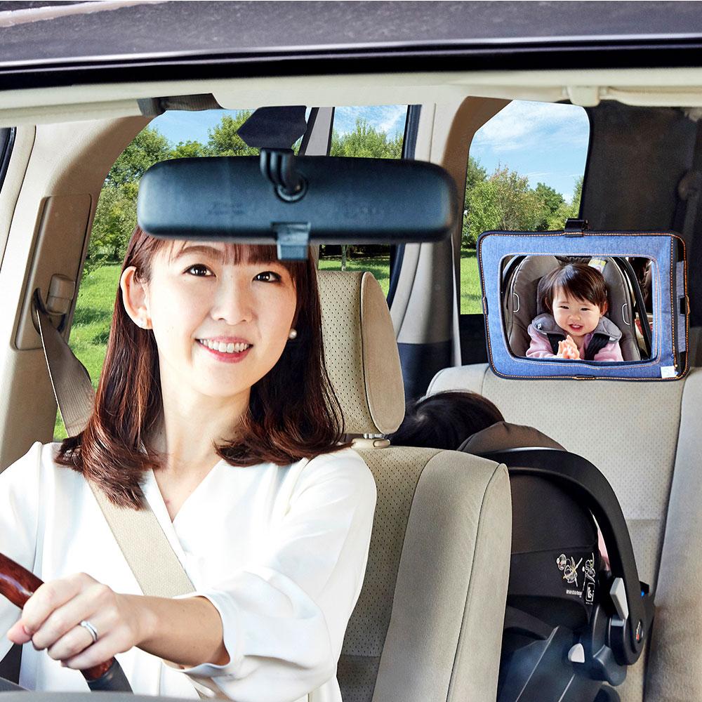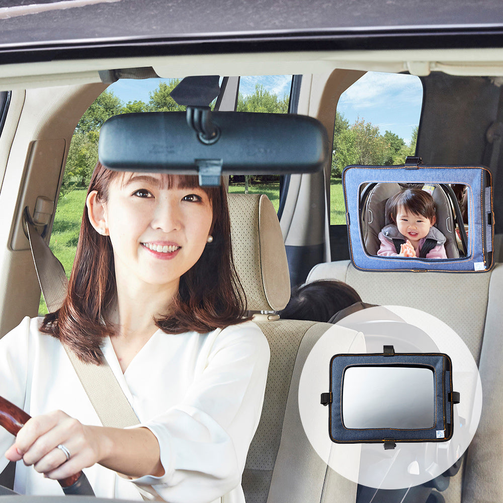 車のヘッドレストに固定し、後部座席のお子様の様子を確認するためのベビーミラー。広範囲を映せる曲面ミラー採用しているので、後部座席が確認しやすい。