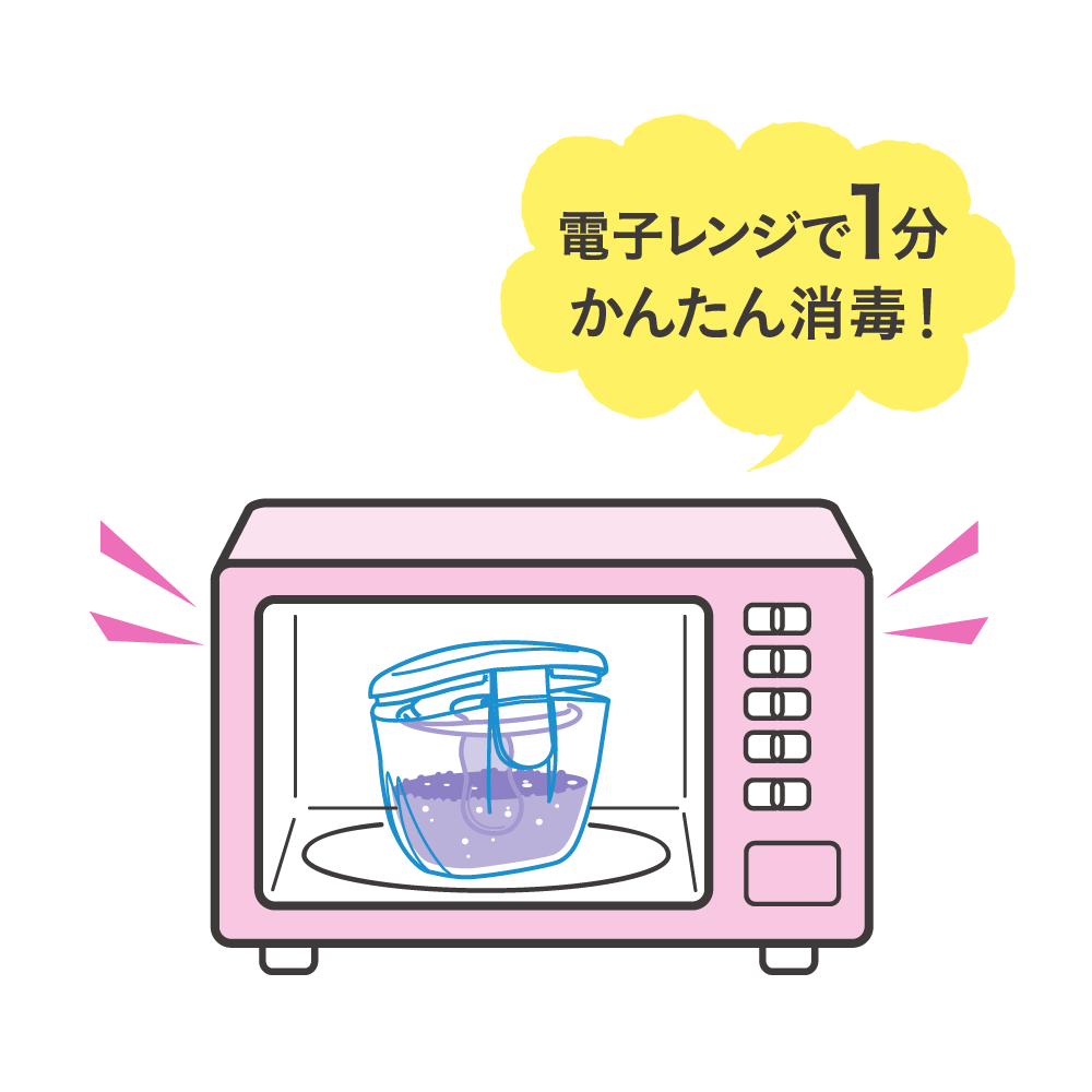 電子レンジで1分! 蒸気で消毒、おしゃぶりをセットするだけの簡単設計、型崩れなしに原型をキープ